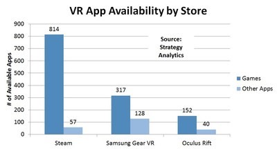 Strategy Analytics 追蹤了三星 GearVR 和 Oculus Rift 的 VR 專屬應(yīng)用商店上推出的應(yīng)用以及 Steam 上的 VR 應(yīng)用。不出所料,游戲類應(yīng)用在所有商店中占比最高。教育內(nèi)容在非游戲類別所占比例最高,并且躋身所有商店前三大內(nèi)容類別之一。Steam 以871款 VR 應(yīng)用擁有最高的開發(fā)者支持,而 Oculus Rift 商店擁有最少應(yīng)用,僅192款。(美通社,2016年12月13日波士頓)