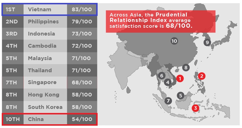 保誠(chéng)保險(xiǎn)公布的2016年保誠(chéng)人際關(guān)系指數(shù)顯示,亞洲人對(duì)人際關(guān)系的總體滿意度較高,為68%。亞洲十個(gè)國(guó)家和地區(qū)中,越南受訪者對(duì)人際關(guān)系的滿意度最高,為83分,其次分別是菲律賓和印度尼西亞。中國(guó)得分最低,僅54分。另外,人們最容易因金錢(qián)、孩子以及缺乏關(guān)注等問(wèn)題產(chǎn)生爭(zhēng)執(zhí)。(美通社,2017年2月9日香港)