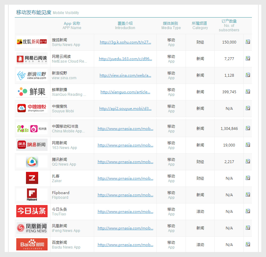d、“移動(dòng)媒體能見度”(Mobile Visibility)新增對(duì)每個(gè)移動(dòng)端(App)的訂戶數(shù)量、發(fā)布頻道進(jìn)行展示呈現(xiàn),幫助客戶了解及定位查詢新聞稿在移動(dòng)端的發(fā)布情況。
