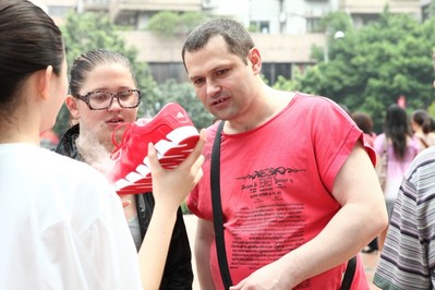 外國友人駐足觀察會冒煙的 adidas ClimaCool Ride 清風跑鞋,該款鞋因為鞋面的大網格設計,運動后比普通跑鞋濕度低20%
