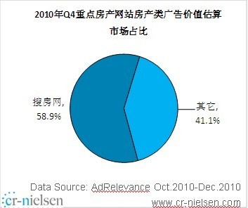 北京2011年1月28日電 /美通社亞洲/ -- 近期,全球權威機構CR-Nielsen(尼爾森)發布《2010年第四季度中國房地產網絡展示廣告市場研究項目報告》(以下簡稱報告)顯示,2010四季度年中國房地產網絡展示廣告市場整體發展良好,廣告推廣項目、廣告主數、創意數環比第三季度均有穩健增長。搜房網在這三個核心考核指標中以近六成的比例高居榜首,其中在房產類廣告主指標上優勢顯著,行業占比高達75.9%。