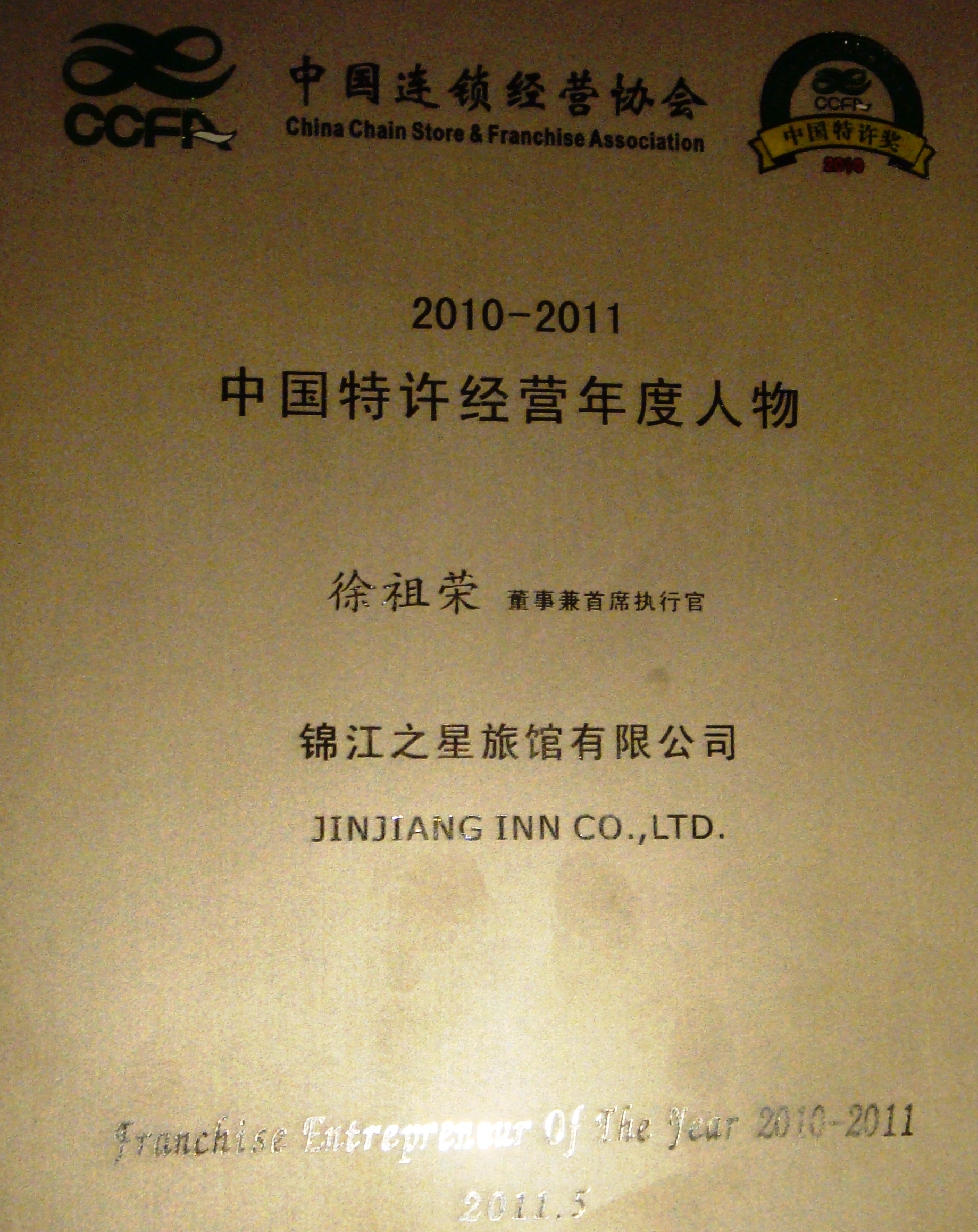 大會(huì)還將2010-2011中國特許經(jīng)營年度人物的榮譽(yù)稱號(hào)授予了錦江之星的掌門人徐祖榮先生,以感謝他在中國連鎖經(jīng)營發(fā)展方面所作出的突出貢獻(xiàn)。