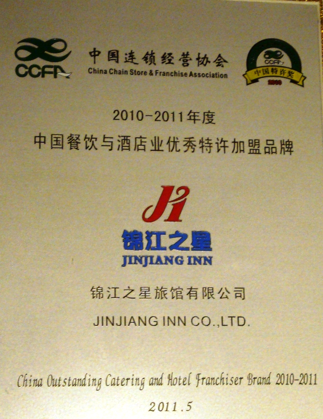 上海2011年5月8日電 /美通社亞洲/ -- 由中國連鎖經(jīng)營協(xié)會(huì)主辦,歷時(shí)兩個(gè)月的“2010-2011年度中國優(yōu)秀特許加盟品牌”評(píng)選工作日前在京揭曉,錦江之星以發(fā)展速度快、盈利模式好、標(biāo)準(zhǔn)化程度高、授權(quán)體系完善等優(yōu)勢(shì)獲此殊榮,錦江之星的首席執(zhí)行官徐祖榮先生同時(shí)榮獲2010-2011中國特許經(jīng)營年度人物。這是中國連鎖經(jīng)營協(xié)會(huì)和廣大投資人對(duì)錦江之星品牌的充分肯定。