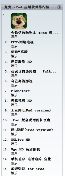上海2011年5月17日電 /美通社亞洲/ -- 蘋果 iPhone4、iPad1、iPad2 的相繼推出,使眾多“果粉”趨之若鶩,市場異常火爆。隨著蘋果平板電腦進入高速增長階段,各類 APP 應用也應運而生。截止到目前,PPTV 網絡電視在 APP 應用中免費 iPad 應用軟件排行榜位列視頻軟件榜首。