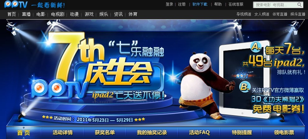 上海2011年5月20日電 /美通社亞洲/ -- PPTV 網(wǎng)絡(luò)電視正式步入7年發(fā)展新歷程,為感謝眾多忠實(shí)擁護(hù)者7年來的陪伴,大規(guī)模開展系列慶生活動(dòng)。5月23日 - 29日,一場以“PPTV‘七樂融融’慶生會(huì),7天 iPad2 送不停”為主題的線上排隊(duì)?wèi)c生抽獎(jiǎng)活動(dòng),在國內(nèi)火熱展開。通過每天7臺(tái),連續(xù)7天送出49臺(tái)新款蘋果 iPad2 為用戶禮物以及2000張(僅限北上廣三地) 3D 《功夫熊貓2》電影票,回饋一直以來支持 PPTV 網(wǎng)絡(luò)電視的用戶,與億萬網(wǎng)民一同分享國內(nèi)首屈一指的網(wǎng)絡(luò)電視媒體7年成長喜悅。(活動(dòng)官網(wǎng):http://7.pptv.com)