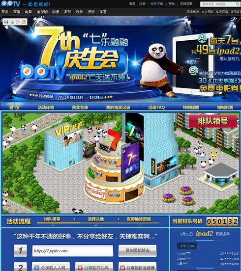 截止到29日活動結(jié)束還有6天時(shí)間,用戶凡是登錄 PPTV 網(wǎng)絡(luò)電視官網(wǎng),進(jìn)入活動頁面點(diǎn)擊參與活動加入排隊(duì)流程,便會得到一個(gè)排隊(duì)號,號碼每逢7的倍數(shù)即有機(jī)會參與抽獎。為了讓后續(xù)的活動中獎幾率保持如活動開始時(shí)一樣,當(dāng)天的抽獎號碼如未中獎,當(dāng)天獎池內(nèi)便會清空一次,以確保活動第二天網(wǎng)友均有機(jī)會獲得 PPTV 送出的7臺 iPad 大獎和千張電影券,也就是說網(wǎng)友們可以連續(xù)7日排隊(duì)拿大獎,iPad2 送不停。
