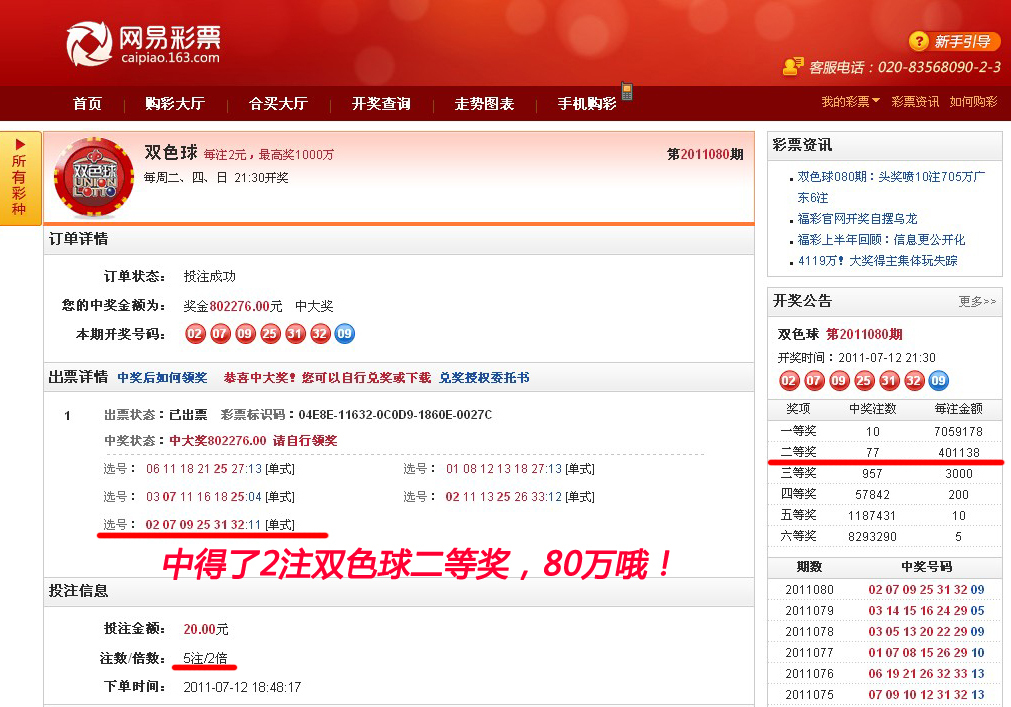北京2011年7月14日電 /美通社亞洲/ -- 7月12日,雙色球第2011080期開獎,網易彩票用戶“湯土包”攬獲2注雙色球二等獎,獎金高達80萬余。這也是繼7月10日,2千多名網友通過網易彩票合買彩票的方式共獲38萬元大獎之后,網易彩票傳來的又一喜報。