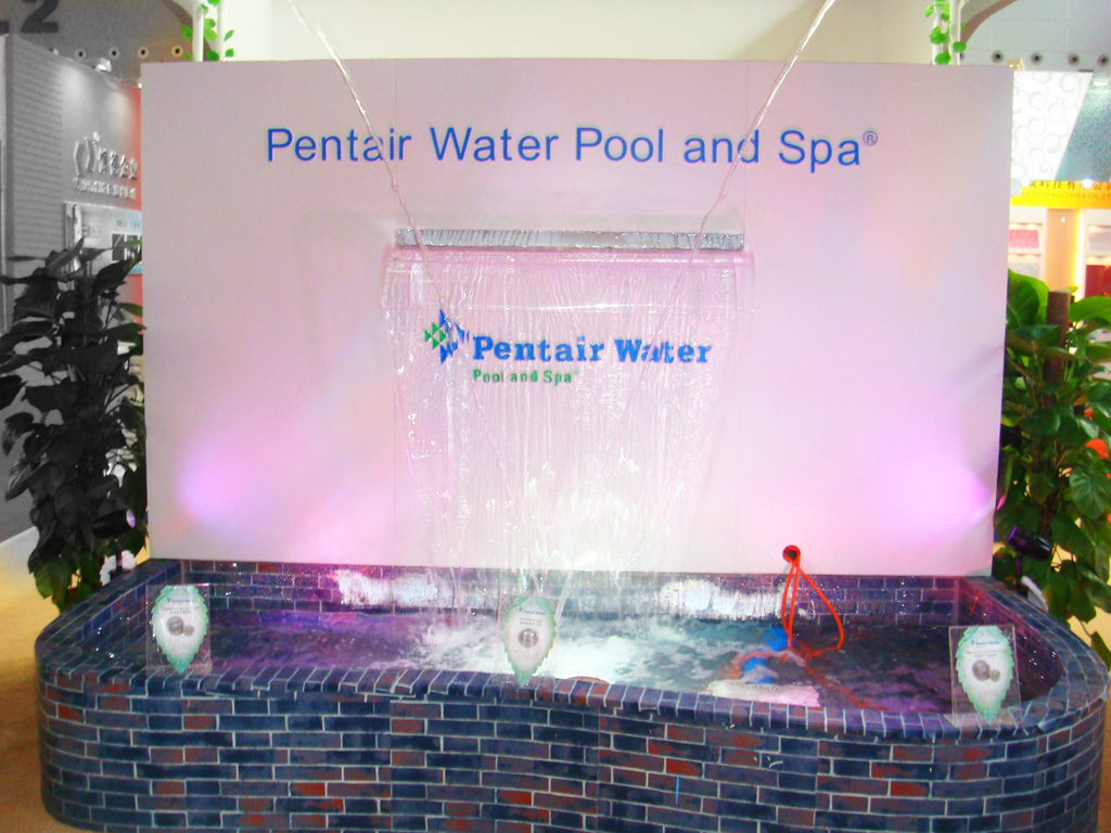 展會(huì)期間,流動(dòng)的水景是濱特爾展位的一大亮點(diǎn),兩米寬的水幕瀑布不間斷地營造出晶瑩剔透的水簾效果,在五彩繽紛的燈光襯托下顯得格外引人矚目。魔力光泉作為今年濱特爾泳池業(yè)務(wù)的新品,在展臺兩側(cè)向中心噴射出美麗的弧線。更令人驚訝的是,噴嘴噴出的拋物線就像一根玻璃管,沒有任何水花濺出,隨著 LED 燈不斷變化色彩,整個(gè)水景引起了專業(yè)人士及所有參觀者的興趣。