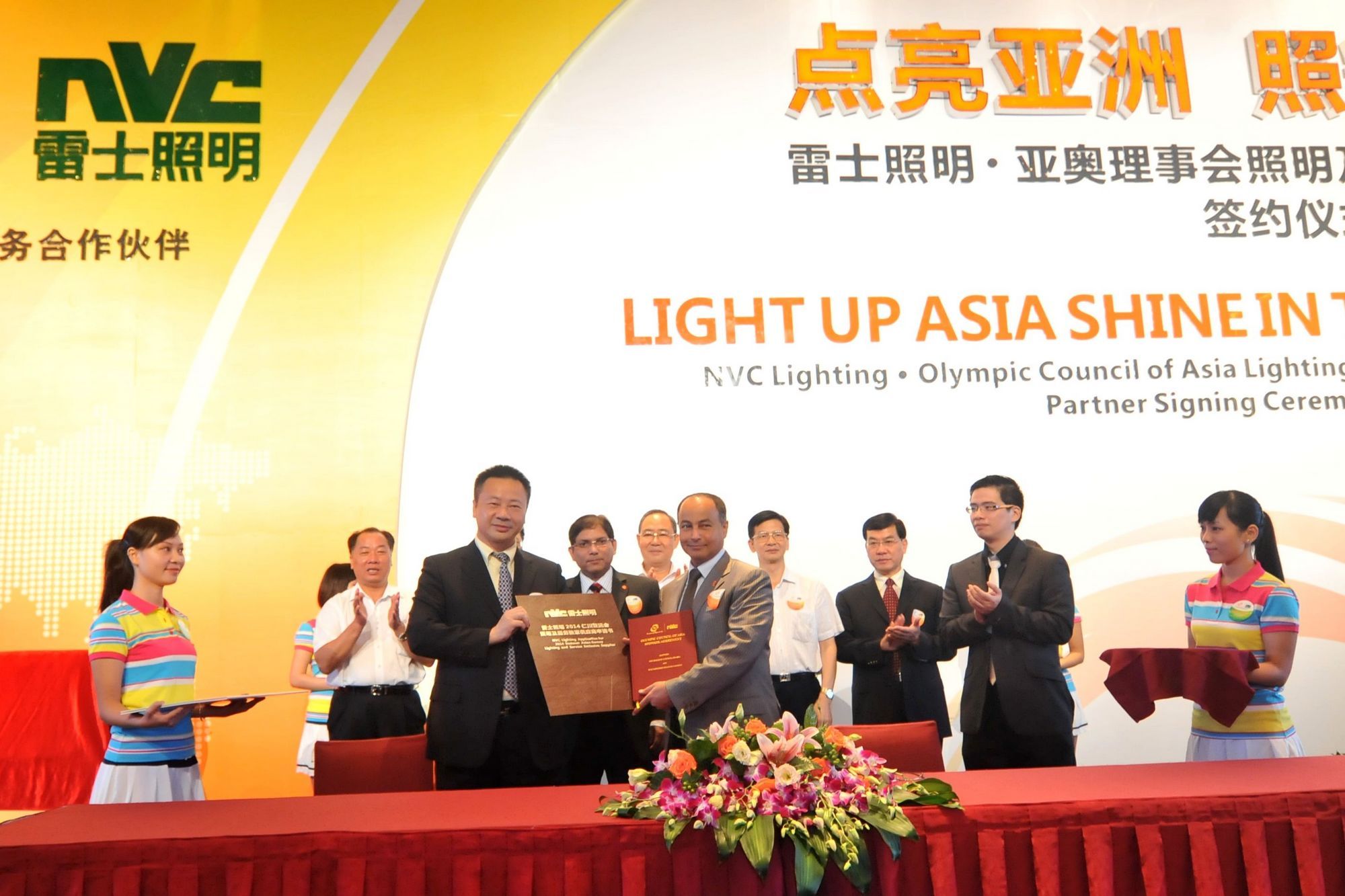 在與會者共同見證下,雷士照明董事長吳長江和亞奧理事會總干事侯賽因作為雙方代表現(xiàn)場簽字,雷士照明正式成為“亞奧理事會照明及服務(wù)合作伙伴”。隨后,在歡慶喜悅的氣氛中,雷士照明與亞奧理事會互贈了紀念禮品。