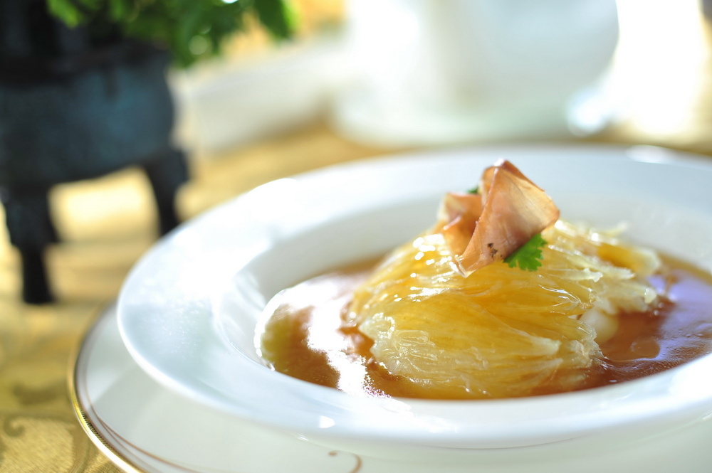 以傳統(tǒng)粵菜配合美景的中餐廳君綽軒,更為賓客締造味覺、視覺同享的品賞盛宴,圖為菜膽肘子片燉鮑翅