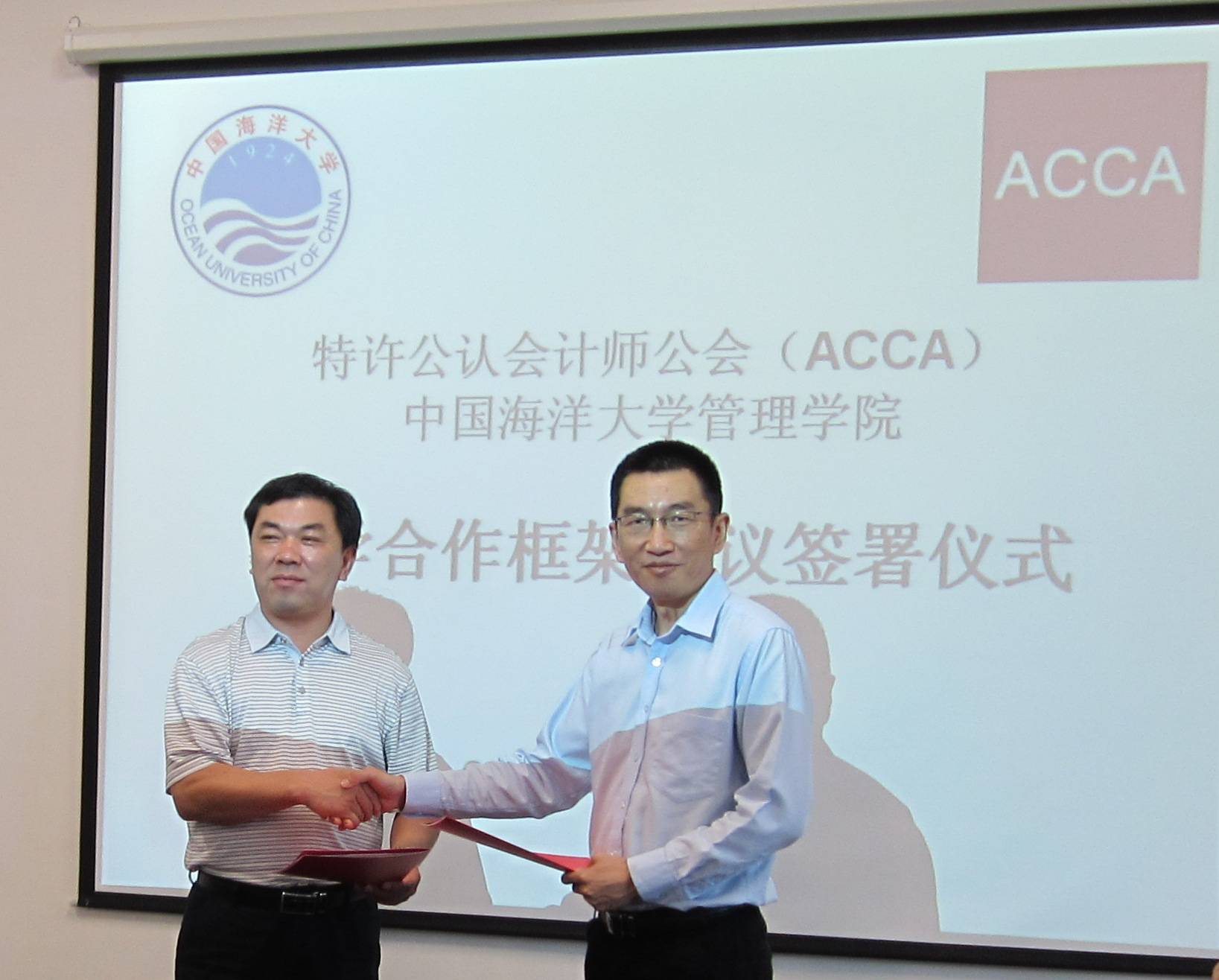 中國海洋大學管理學院教學合作框架協(xié)議”簽署儀式在中國海洋大學管理學院隆重舉行。ACCA 北京代表處首席代表于翔天先生與管理學院院長權(quán)錫鑒教授、副院長兼會計學系主任王竹泉教授等進行了親切的會談并簽署了正式合作協(xié)議。根據(jù)協(xié)議,管理學院將 ACCA 國際財會資格課程嵌入到會計學專業(yè)本科教學中,計劃于2012年開始招收第一期 ACCA 方向班學員,培養(yǎng)緊缺的國際化高級財會人才。
