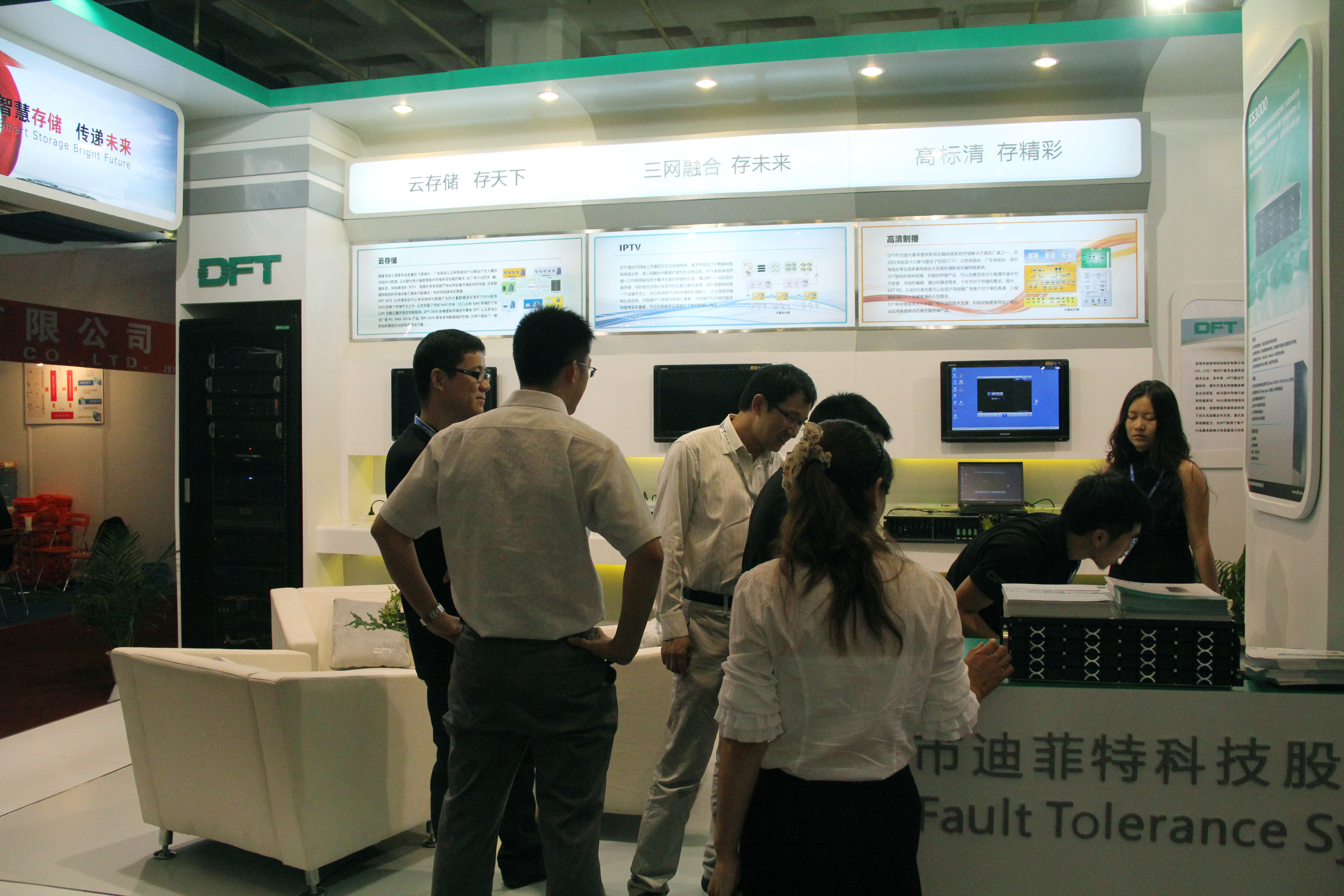 DFT 是國(guó)內(nèi)知名的和極具發(fā)展?jié)摿Φ拇鎯?chǔ)產(chǎn)品和解決方案供應(yīng)商。自1998年成立以來,一直專注于廣電行業(yè)媒資、非編等行業(yè)應(yīng)用以及各領(lǐng)域和各環(huán)節(jié)對(duì)存儲(chǔ)產(chǎn)品的應(yīng)用和發(fā)展趨勢(shì),并攜手中科大洋、索貝等行業(yè)知名 SI 為廣電行業(yè)客戶提供專業(yè)的個(gè)性化存儲(chǔ)解決方案。大會(huì)首日,甫一亮相的 DFT 展館即以新穎別致的造型吸引了眾多到場(chǎng)客商的目光,而豐富又直擊行業(yè)熱點(diǎn)技術(shù)的產(chǎn)品和解決方案更是讓所有觀眾駐足。DFT 展臺(tái)的 IPTV、云存儲(chǔ)、高標(biāo)清三個(gè)展區(qū)是針對(duì)廣電行業(yè)目前新型和熱點(diǎn)的技術(shù)應(yīng)用而開設(shè),分別展示了 DFT 在各熱門技術(shù)領(lǐng)域的產(chǎn)品和個(gè)性化解決方案;DFT 品牌展區(qū)著重介紹了 DFT 公司的概況和發(fā)展歷程等,向現(xiàn)場(chǎng)觀眾直觀、立體地展現(xiàn)了 DFT 企業(yè)形象和雄厚實(shí)力;而 DFT 自主研發(fā)的 ES 系列產(chǎn)品既是本次 DFT 展館的亮點(diǎn)也是重點(diǎn)內(nèi)容之一。DFT ES 系列磁盤陣列是具備企業(yè)級(jí)數(shù)據(jù)保護(hù)功能的虛擬化網(wǎng)絡(luò)存儲(chǔ)系統(tǒng),實(shí)現(xiàn)了集成數(shù)據(jù)保護(hù)、虛擬服務(wù)器整合應(yīng)用等創(chuàng)新功能,能夠?yàn)閿?shù)據(jù)中心的商業(yè)應(yīng)用提供高可靠性和高可擴(kuò)展性。DFT 為現(xiàn)場(chǎng)客戶提供了實(shí)體機(jī)器參觀、Vedio 動(dòng)態(tài)解說、巨型海報(bào)展示和詳細(xì)的產(chǎn)品資料,并有技術(shù)專家現(xiàn)場(chǎng)解答,充分營(yíng)造了一個(gè)多維互動(dòng)、形式多樣的現(xiàn)場(chǎng)體驗(yàn)、觀摩環(huán)境。
