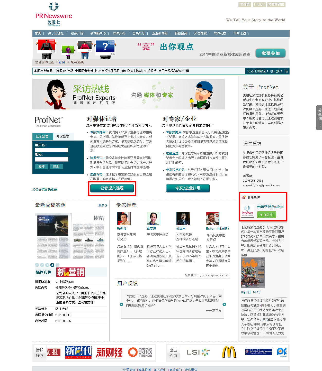 美通社中國區董事總經理陳玉劼說:“美通社在2007年將在北美新聞界、公關界人盡皆知皆用的采訪熱線(ProfNet)平臺引入中國,為中國的媒體與專家、企業搭建起一個快速溝通的橋梁,新版采訪熱線結合中國最流行的微博等社交媒體工具,充分發揮了采訪熱線的社交互動優勢,為媒體和專家、企業新聞發言人提供更實時、便捷的溝通交流平臺。”