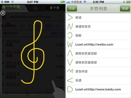 海豚瀏覽器一大特色是其首創(chuàng)的手勢(shì)操作,這一特色在 iPhone 版中得以保持。用戶可以自定義專(zhuān)屬手勢(shì),來(lái)完成絕大部分操作,只需輕輕一劃,徹底擺脫點(diǎn)擊輸入的煩惱。