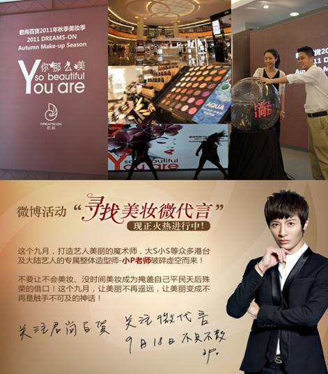 君尚百貨http://weibo.com/junshangbaihuo還在新浪微博上發起了名為“尋找美妝微代言”征集活動,這是新浪微博上首例以“微代言”為主題的微博選秀活動,此口號一打響,便在新浪微博平臺上引起軒然大波。9月2日至9月16日,召集網友曬出妝前妝后對比照,上傳至君尚百貨官方微博即可參選活動,亞洲最爆人氣造型師小P老師將親臨現場,并參與評選的全過程,最后由小P老師認定10強殊榮,冠亞季軍將分獲5000元、3000元、2000元化妝品大禮包以及300元美妝禮包。
