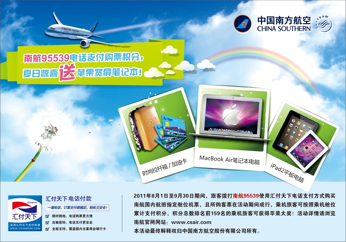 各大航空公司都在長假前推出了一系列購票優惠活動。近日,中國南方航空為答謝廣大用戶,聯合金融級電子支付專家匯付天下帶來一場假日活動盛宴。即日起至2011年9月30日,撥打南航銷售服務熱線95539使用電話支付方式購買南航國內航班指定艙位機票,乘客可按乘機艙位累計支付積分,積分總數排名前159名的乘客可獲得蘋果 MacBook Air 筆記本電腦、iPad2平板電腦、時尚拉桿箱及中石化加油卡等驚喜大獎?;顒釉斍檎垶g覽南航官網 www.csair.com ,或撥打南航銷售服務熱線95539咨詢。