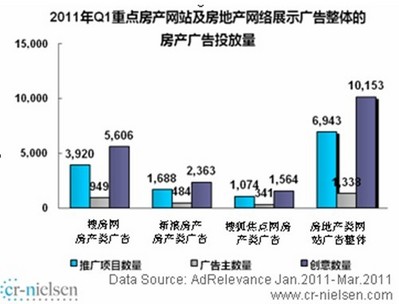 北京2011年11月1日電 /美通社亞洲/ -- 搜房網委托 CR-Nielsen(尼爾森互聯網研究)所做的《2011年中國房地產網絡展示廣告市場研究項目報告》顯示,2011年中國房地產網絡展示廣告市場第三季度呈持續增長態勢。2011年 Q3房產類網絡展示廣告推廣項目數為16558,環比增長16.4%,同比增長65.0%;廣告主數為1939,環比增長11.3%,同比增長22.1%;創意數為24709,環比增長21.6%,同比增長62.9%。