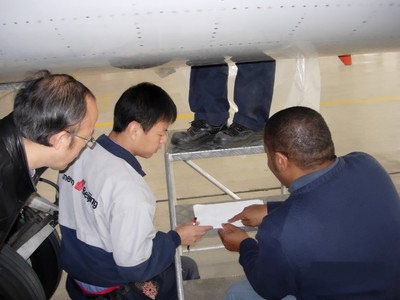 國航和北京飛機維修工程公司(Ameco)技術(shù)人員在安裝機上無線局域網(wǎng)設(shè)備
