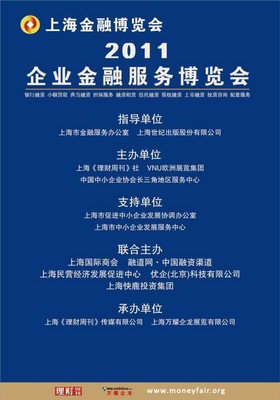 由《理財周刊》社和 VNU 歐洲展覽集團聯合主辦的理財博覽會已經成功舉辦了8屆,多年來上海理財博覽會受到各界廣泛贊譽,是目前國內展出規模較大、參展機構齊全、參觀人數最多、活動最豐富的金融業年度盛會。今年,在2011上海企業金融服務博覽會的強力助陣下,理財博覽會大幅擴容,并有了一個全新的名字 -- 上海金融博覽會。本屆金融博覽會全面覆蓋個人理財和企業金融服務,來自銀行、保險、證券、外匯、黃金、房產、集藏等行業近200家展商將參展。在著眼于家庭理財的服務理念發展的同時,本屆金融博覽會的一大亮點是為中小微企業提供金融對接平臺,特別單獨設立了中小企業展館,旨在為中小企業提供全面的企業金融服務。