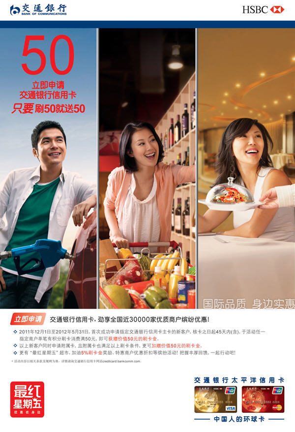 2011年12月1日起,交通銀行信用卡展開了聲勢浩大的“刷50送50元”全國性跨年大回饋活動,此次活動聯(lián)合了全國近30,000家優(yōu)質(zhì)商戶,包括“最紅星期五”活動覆蓋全國逾160個城市的3,700多家超市門店和1,700多個加油站商戶、2萬多家精選特惠商戶和交通銀行聯(lián)名信用卡商戶。凡是在2011年12月1日至2012年5月31日期間,成功申請了指定交通銀行信用卡主卡的新客戶,在核卡之日起的45天內(nèi)(含)在上述商戶中任意一家單筆刷卡消費(fèi)滿50元,就可獲贈50元刷卡金。如同時申請附屬卡,且附屬卡也滿足上述刷卡條件,更可加贈50元刷卡金。