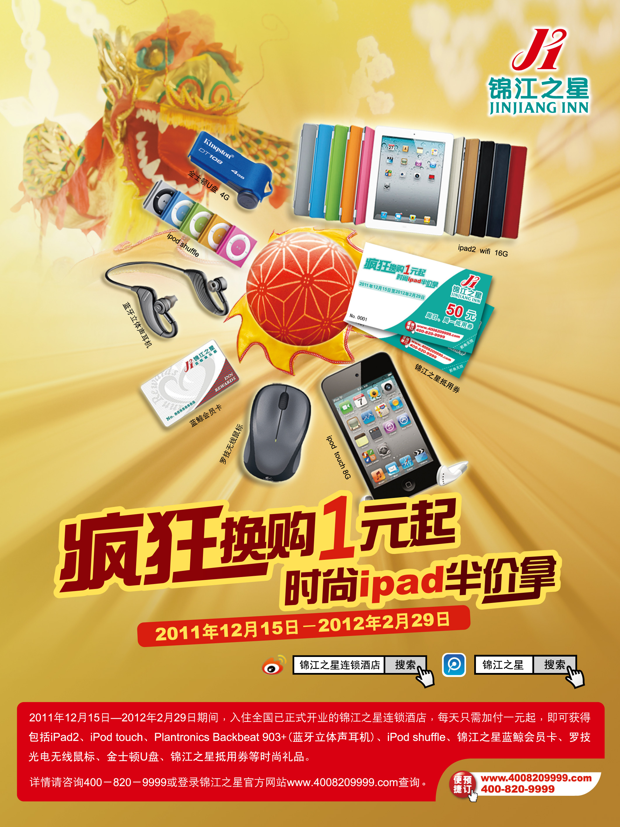 上海2011年12月6日電 /美通社亞洲/ -- 在連續(xù)兩年推出“千萬獎品別錯過”活動引爆春節(jié)市場后,錦江之星將于2012年春節(jié)期間再掀優(yōu)惠風(fēng)暴。從2011年12月15日起,至2012年2月29日,錦江之星將推出“瘋狂換購1元起,時尚iPad半價拿”主題優(yōu)惠活動,錦江之星體驗(yàn)券、藍(lán)鯨會員卡和眾多時尚數(shù)碼獎品,只要1元起,即可超值換購。