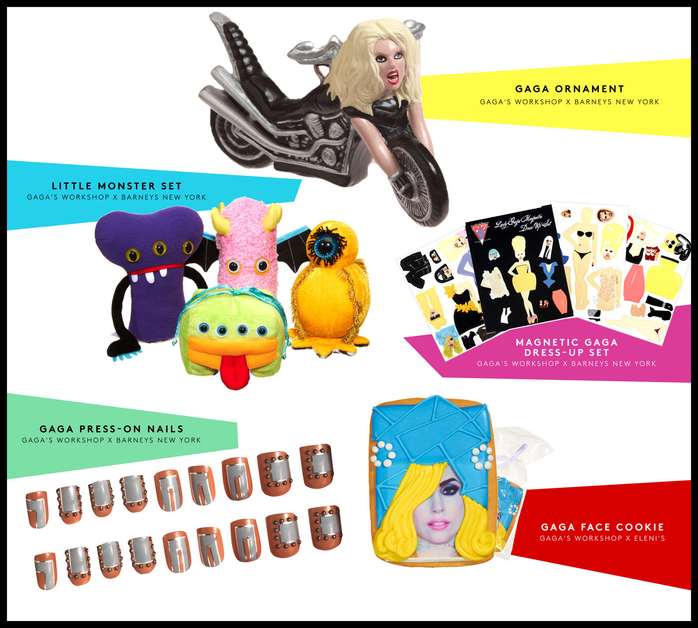 作為一個多方面的慶?;顒?,GAGA'S WORKSHOP 包括:經過巧妙改造的零售環境、假日櫥窗、專門的 Gaga 互動網站以及 Lady Gaga 在 Nicola Formichetti 的創意指導下與 assume vivid astro focus (avaf) 的藝術家 Eli Sudbrack 和 Christophe Hamaide Pierson 聯手設計,并與巴尼斯創意總監 Dennis Freedman 合作完成的獨家限量版產品。