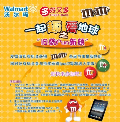 從12月25日開始,全國范圍的沃爾瑪購物廣場還開展“祈福卡送祝福”活動。顧客可到各門店入口服務臺處,領取沃爾瑪精心設計的祈福卡,寫下對家人、朋友的祝福,傳遞心意。(祈福卡數量有限,送完即止)。