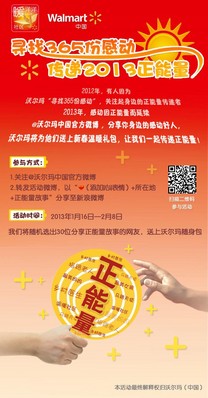 網友可以關注“@社區暖洋洋”,2012年1月5日起至20日期間,分享社區或社會上個人或家庭感人的故事。365個真實、感人、關注度高的微感動故事的主人公將贏得沃爾瑪代表網友送上的溫暖年貨。他們平凡而偉大的草根公益之愛將使龍年的春節充滿溫暖。