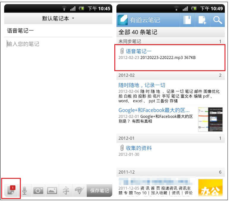 為了讓用戶在使用手機時能快速記錄大量的信息,并在手機和電腦之間進行自動同步,有道云筆記 Android1.2 版增加了錄音筆記功能,用戶不僅可以直接把需要記錄的內容說出來保存在筆記里,也可以在會議、采訪的過程中使用有道云筆記進行錄音,錄音結束后點擊保存同步,這段錄音就能同時出現在用戶的電腦上了。