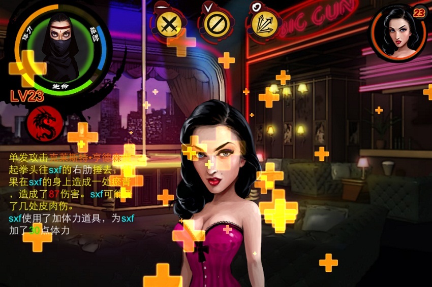 游戲畫面采用的是讓人眼前一亮的美式漫畫風格,當玩家初次登陸游戲時,就會驚訝于 18xN 的角色設計,18個基礎角色模型的背后又可裝扮 N 種發型和服飾,即使嫵媚的女性角色也有股女中豪杰的味道,第一眼就可以讓人血脈賁張,沖擊力十足。