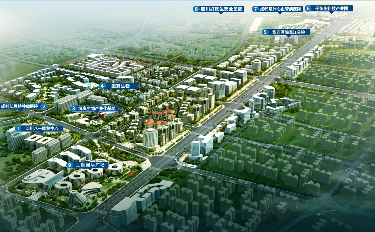截止目前,醫學城已引進醫療健康產業項目20余個。其中,健康醫療板塊已引入包括四川省八一康復中心、博奧生物產業化基地、華西醫院溫江分院、上醫國際廣場、成都艾思特腫瘤醫院、干細胞產業科技園等產業化項目10余個。健康旅游板塊已引入藥用植物博覽園、桫欏國際中藥博覽園、百草園種植生態園、合一庭健康養生會館等近10個特色項目。健康商務板塊已引入醫科總部產業園、醫學商務中心、酒店及商業綜合體、學府杏林等城市功能配套的眾多項目。這此前沿企業和項目落戶醫學城將促進了成都和世界接軌,全面提升了成都市醫學技術水平及其醫療行業的影響力。