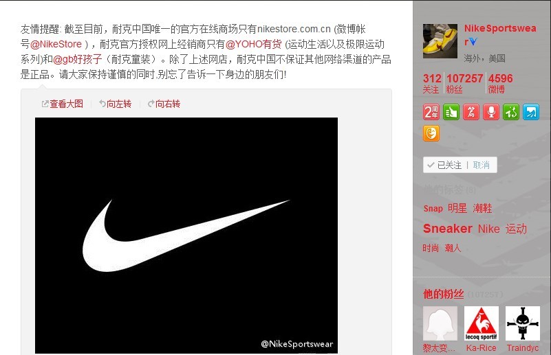微博原文:“友情提醒:截至目前,耐克中國唯一的官方在線商場只有 nikestore.com.cn,耐克官方授權網上經銷商只有‘YOHO!有貨’(運動生活系列及極限運動系列)和‘好孩子’(耐克童裝)。除上述網店,耐克中國不保證其他網絡渠道的產品是正品。請大家保持謹慎的同時,別忘了告訴一下身邊的朋友們!”