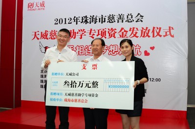 珠海2012年7月12日電 /美通社亞洲/ -- 7月11日,由珠海市慈善總會、珠海電視臺、全球較大通用耗材制造商天威之珠海旗艦工廠——天威飛馬打印耗材有限公司聯(lián)合成立的“天威慈善助學專項資金”,正式啟動2012年度資助計劃,接受來自全國各地珠海戶籍貧困學子的資助申請。