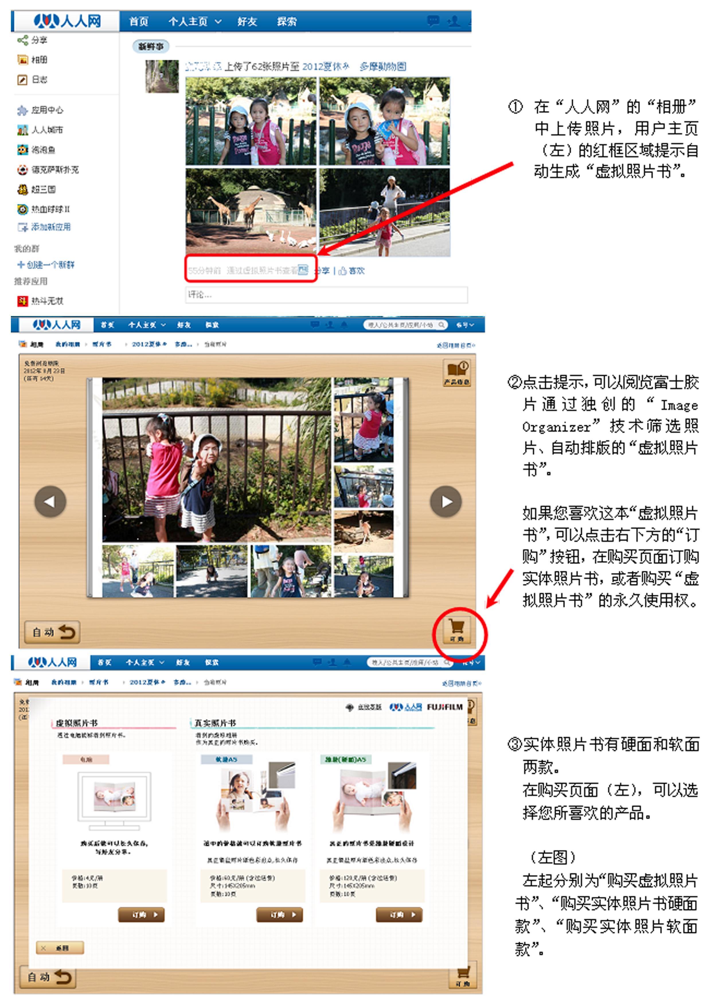 自動生成的虛擬照片書,能夠在“人人網(wǎng)”的個人主頁“相冊”中以鏈接的形式顯示兩周,用戶可以像翻閱實體照片書那樣在網(wǎng)上瀏覽虛擬照片書。用戶如果喜歡該照片書,還可以從“人人網(wǎng)”的頁面直接訂購采用了富士膠片獨有高品質(zhì)銀鹽技術(shù)沖印并裝訂成冊的實體照片書。此外,用戶也可以單獨購買“虛擬照片書”的永久使用權(quán),和朋友盡情分享照片書帶來的樂趣。