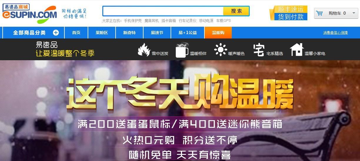 易速品商城此次活動以“這個冬季購溫暖”為主題,從12月 13日一直持續到2013年2月1日?!拔覀兿M茏屜M者們擁有一個不僅是物品上‘溫暖、貼心’,價格上也極其‘溫暖’的購物體驗,讓溫暖陪伴他們以及他們所關心的人度過整個冬天!”針對此活動,易速品商城 CEO 尹貴義這樣說道。
