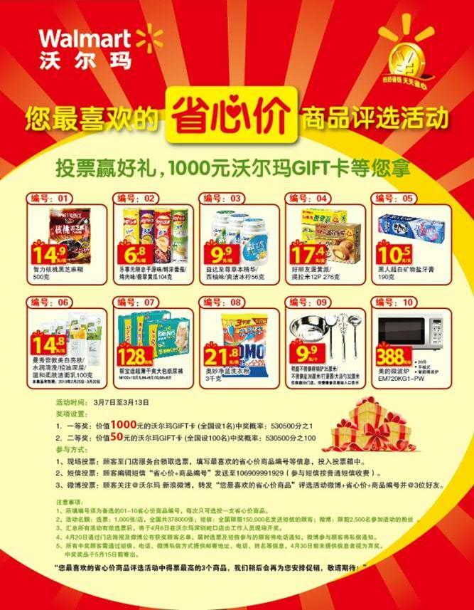 深圳2013年3月7日電 /美通社/ -- 繼去年11月,全國范圍的沃爾瑪購物廣場及好又多門店推出“上千種省心價商品如您所需”的活動后,3月7日起,沃爾瑪再次推出上千種“省心價”商品,包括食品、日用品、家庭用品等品類。同時,3月7日至13日,沃爾瑪邀請顧客參與“您最喜歡的省心價商品評選活動”,顧客通過在門店填寫選票、發(fā)送短信、轉(zhuǎn)發(fā)微博的方式,在10個備選商品中為自己心儀的“省心價”商品投上一票,就可參加幸運抽獎,贏取面值1000元的沃爾瑪 GIFT 卡。獲得顧客投票數(shù)最多的前3名“省心價”商品,沃爾瑪還會為顧客提供后續(xù)的促銷。