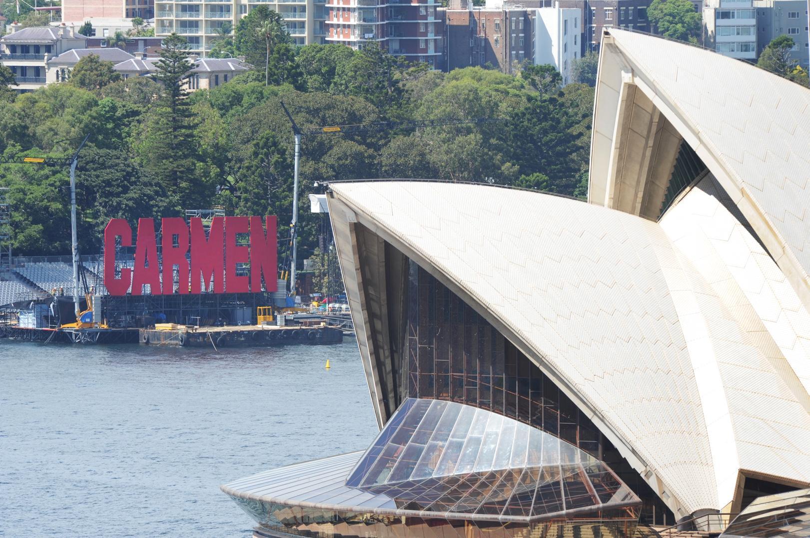 受到好萊塢啟發的 Carmen這幾個字母大小驚人,高達9米,寬25米。 3月22日下周五作品公開上演時,這些字母將在演出期間被主舞臺和周圍的照明塔的聚光燈照亮。歌手和舞者在演出期間攀爬和演出的字母支架結構已被加倍加固。舞臺本身有32米長和24米寬,類似于一個血染的圓形斗牛場。它坐落在由埋入悉尼港16座塔架支撐的平臺之上。