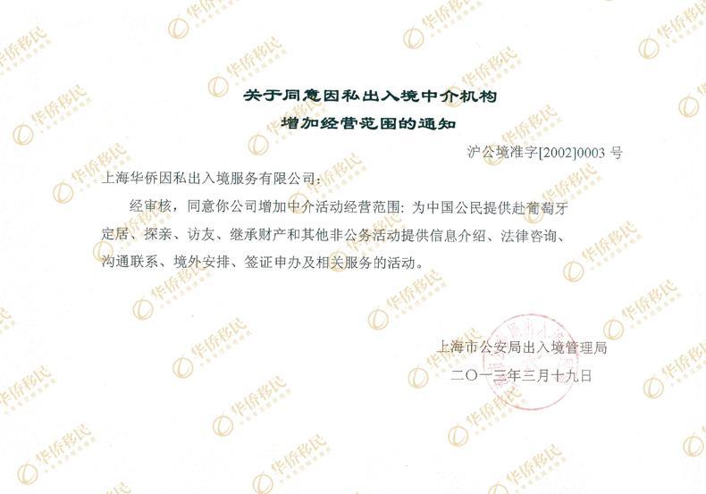 經(jīng)過幾個月漫長的考核,上海市公安局出入境管理局認(rèn)可了華僑移民增加辦理葡萄牙移民經(jīng)營范圍。華僑移民可以為中國公民提供赴葡萄牙定居、探親、訪友、繼承財(cái)產(chǎn)和非公務(wù)活動提供介紹、法律咨詢、溝通聯(lián)系、境外安排、簽證申辦及相關(guān)服務(wù)的活動。華僑移民終于獲批上海市公安局出入境管理局的正式批文,并已經(jīng)送達(dá)華僑移民上??偛?。