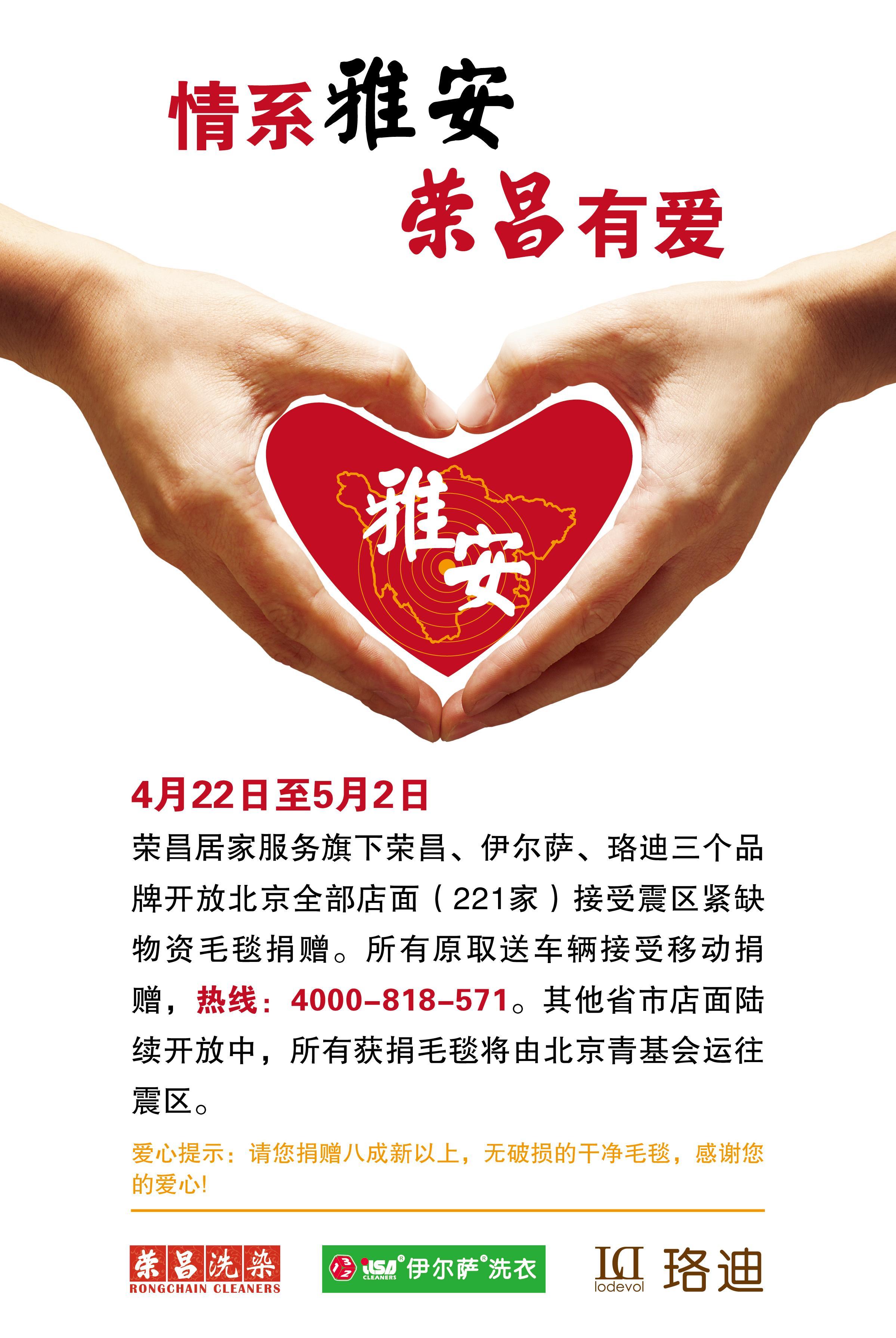 雅安2013年4月23日電 /美通社/ -- 雅安地震,牽動(dòng)著每位國(guó)人的心。面對(duì)災(zāi)區(qū)受難同胞保暖御寒物資緊缺局面,4月22日至5月2日,榮昌居家服務(wù)旗下榮昌、伊爾薩、珞迪三個(gè)品牌開放北京全部店面(221家)接受震區(qū)緊缺物資毛毯的捐贈(zèng)。公司所有原幾十輛取送車輛也將全部在北京市區(qū)內(nèi)接受移動(dòng)捐贈(zèng),熱線:4000-818-571。同時(shí),榮昌公司將捐出4月26日(七日祭)當(dāng)天直營(yíng)店的全部收入。其他省市店面陸續(xù)開放中,所有獲捐毛毯將由北京青基會(huì)運(yùn)往震區(qū)。