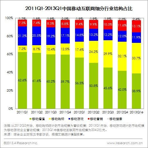 2013Q1 由于是網(wǎng)購(gòu)的淡季,移動(dòng)購(gòu)物在整體市場(chǎng)中的占比增幅較小,然而移動(dòng)購(gòu)物的市場(chǎng)依然保持了較高增長(zhǎng);移動(dòng)增值雖然仍是移動(dòng)互聯(lián)網(wǎng)占比較高的細(xì)分行業(yè),但其占比持續(xù)下降,傳統(tǒng)的增值業(yè)務(wù)不斷被其他領(lǐng)域擠壓,新興增值業(yè)務(wù)體量尚小;移動(dòng)游戲增速較為平穩(wěn),在其他領(lǐng)域增速較高的背景下市場(chǎng)份額也處于下降趨勢(shì);而新興的移動(dòng)搜索及移動(dòng)營(yíng)銷基數(shù)較小,增速較高,占比也處于快速增長(zhǎng)狀態(tài)。艾瑞預(yù)計(jì)未來移動(dòng)購(gòu)物將成為移動(dòng)互聯(lián)網(wǎng)較大細(xì)分行業(yè)。