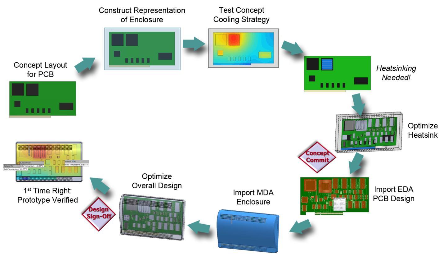 持續(xù)該過程直至設(shè)計師滿意(他/她得到了很好的熱管理解決方案)為止。與熱相關(guān)的零部件正確放置于PCB板上。PCB板正確放置于機箱內(nèi)。機箱形狀和材料可提供良好的傳導、對流或熱輻射散熱。然后,即可結(jié)束概念設(shè)計工作,信息傳遞給 MDA 和 EDA 設(shè)計師,用于詳細設(shè)計。