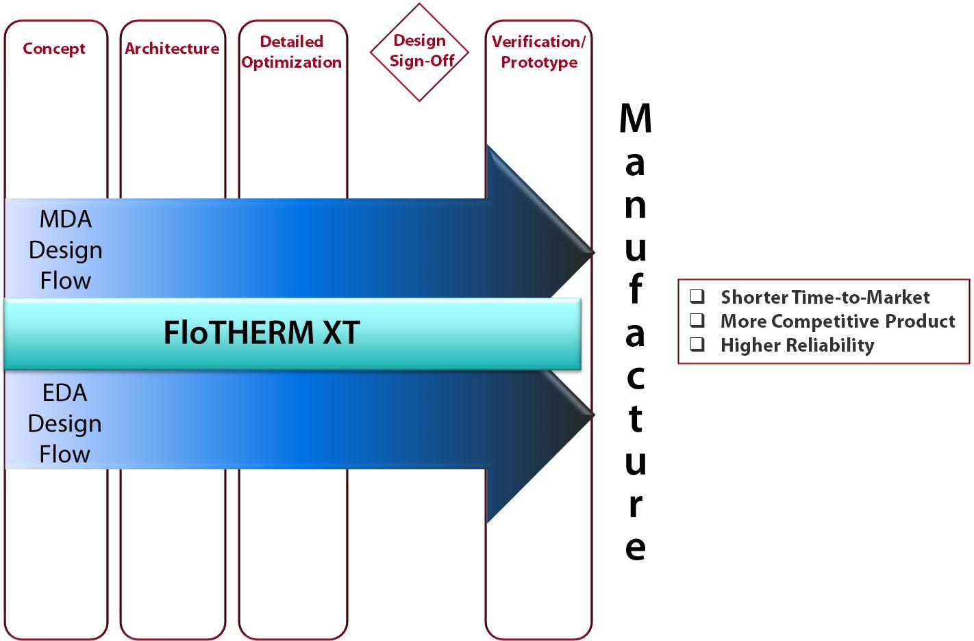 通過采用Mentor Graphics公司新的 FloTHERM XT 解決方案,機械設(shè)計師或熱設(shè)計工程師能輕松創(chuàng)建IC、PCB和機箱的概念模型,然后進行模擬,看看能否有效散熱。如果能的話,那么從熱管理角度來看,設(shè)計就能進行下去。如果任何一個其它設(shè)計部門的人員經(jīng)過概念階段后發(fā)現(xiàn)無法進行下去,他們可能需要改變系統(tǒng)的功能規(guī)范、尺寸規(guī)格、使用的器件或其它一些因素。然而,如果在后續(xù)的開發(fā)過程中才發(fā)現(xiàn)問題并重新設(shè)計的話,所需成本就會顯著增加。