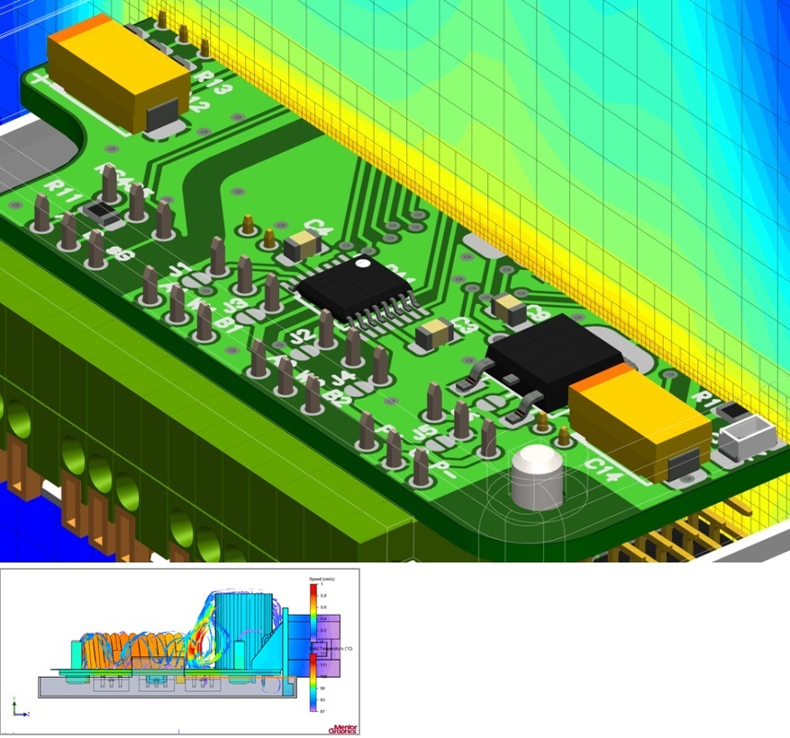 然后設(shè)計師可以創(chuàng)建一個概念設(shè)計機箱,并將PCB板置于機箱內(nèi)。FloTHERM XT 擁有完整的機械設(shè)計功能,因此,可根據(jù)需要細化元器件或者機箱的模型,以正確描述目標產(chǎn)品。PCB板置于機箱內(nèi)以后,便可添加邊界條件并進行 CFD 熱仿真分析。設(shè)計師可根據(jù)結(jié)果修改元器件布局、為過熱元器件添加散熱片、修改機箱,然后重新進行分析。