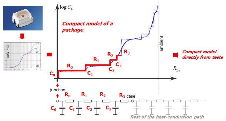 最基本的方法是測(cè)量部件與溫度相關(guān)的電壓。LED 從一個(gè)穩(wěn)定的狀態(tài)打開(kāi)或關(guān)閉,過(guò)一段時(shí)間之后,又到達(dá)另一個(gè)穩(wěn)定的狀態(tài)(熱/冷,反之亦然)。在這個(gè)過(guò)程中不斷進(jìn)行瞬態(tài)測(cè)量,提供很小測(cè)量電流下的熱瞬態(tài)響應(yīng)曲線。在測(cè)量出的溫度差異和功率差異(用于開(kāi)關(guān)部件)(圖2)的幫助下,便可得出結(jié)構(gòu)函數(shù)(圖3)。