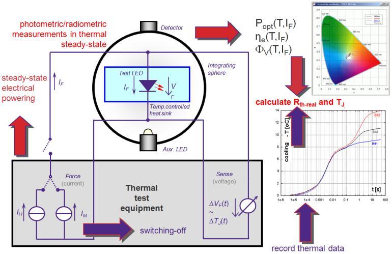 熱分析對(duì)于了解發(fā)光二級(jí)管的缺陷至關(guān)重要,可用來(lái)獲得熱阻信息以及測(cè)試合適的粘結(jié)劑或熱界面材料來(lái)確保裝配后的較佳熱管理能力。但用來(lái)給發(fā)光二級(jí)管供電的總電力被轉(zhuǎn)化為熱和光。因此,如圖4所示,為了正確進(jìn)行熱分析,發(fā)光二級(jí)管產(chǎn)生的光功率應(yīng)從供給電力中減去,從而得出真正的內(nèi)部熱阻(完全基于發(fā)光二級(jí)管的熱功率)。