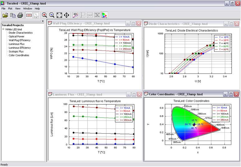 通過(guò)明導(dǎo)的 TERALED/T3Ster 測(cè)試硬件,也可以從測(cè)量中導(dǎo)出參數(shù),如總光通量、總輻射通量、X、Y 和 Z 三色值,同時(shí)還可以完成一份頻譜分析。通過(guò)一種單一的綜合測(cè)量方法,可能會(huì)測(cè)出二極管特性、光功率、輻射效率、光通量、發(fā)光效率、暗視覺(jué)通量和色坐標(biāo)對(duì)電流和溫度的依賴性,并將其顯示為 LED 的驅(qū)動(dòng)電流、接面溫度或冷板溫度的一個(gè)函數(shù)(見(jiàn)圖5)。