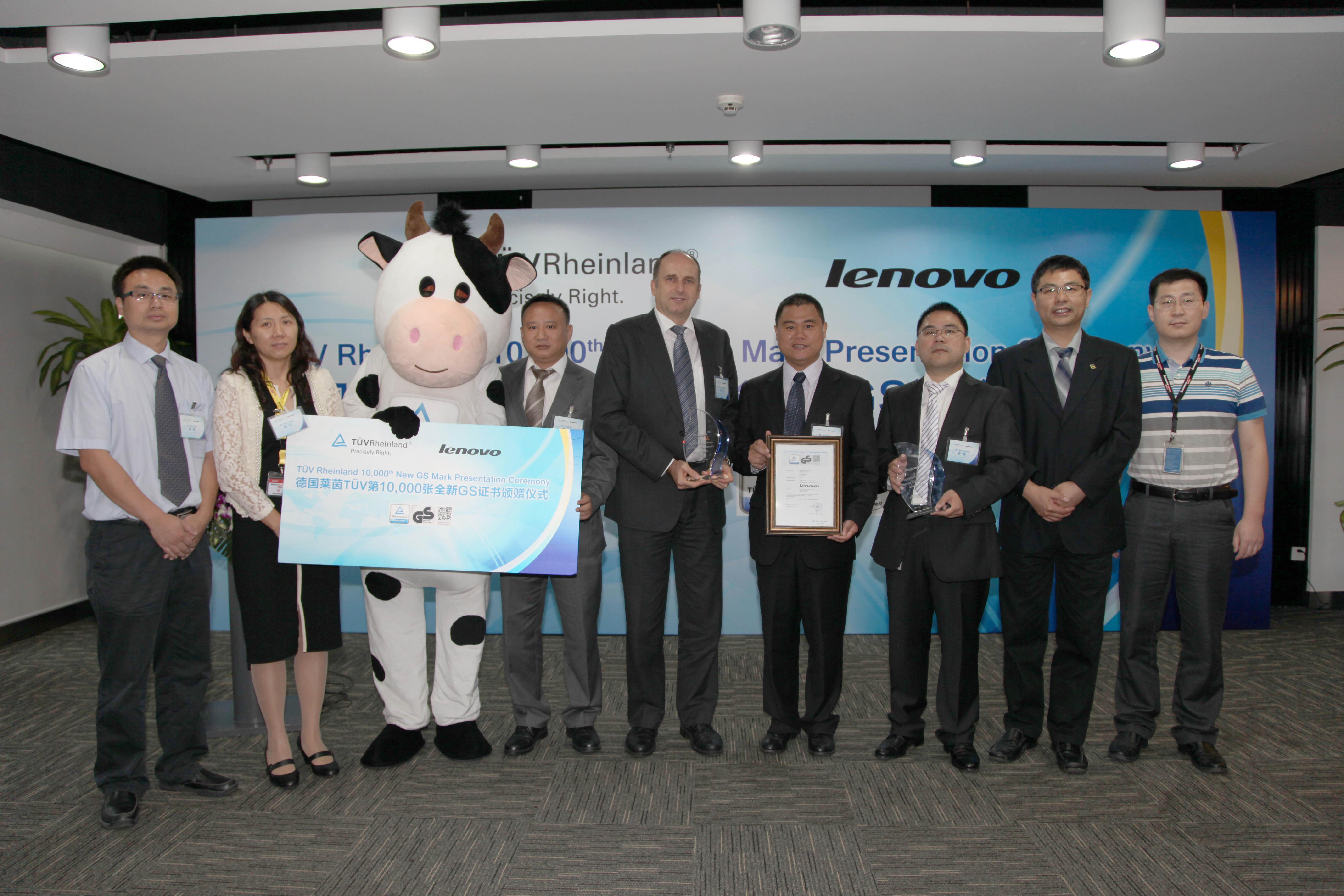德國萊茵TUV一百多年來一直注重科技、人類與環境互動的企業使命。長久以來,德國萊茵TUV不僅以安全與品質的認證權威贏得國際信賴,更為客戶提供完整及多樣性的定制化解決方案。2013年初,德國萊茵TUV推出了最新的全球統一測試標識,其型式與功能在檢測領域可謂獨一無二,將取代德國萊茵TUV在過去的140年間使用過的全部檢測標識。加入了二維碼的功能,可通過智能手機掃描鏈接到德國萊茵的數據庫,進一步提升了測試產品及系統的透明度和完整性。德國萊茵的全新測試標識代表著德國萊茵檢驗的真實可靠性、權威性和準確度。而其第10,000張帶有全新測試標識的全新GS證書花落聯想的可喜驚喜也再度讓雙方的合作推向一個有意義的新高度。
