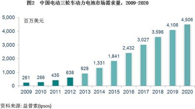 益普索(Ipsos)在發布的《中國電動車及電動車動力電池市場及行業分析》研究報告中稱,由于政府鼓勵使用替代能源減小對石油的依賴性,受環境友好型電動汽車制造商強勁需求的推動,電池產品市場在2013年至2020年間有望取得12%的復合年增長率。益普索(Ipsos)數據顯示據預測,電池產品總銷售額將于2020年達到112億美元,較2012年的約52億美元翻了一倍多。益普索咨詢(Ipsos Business Consulting)北京負責人崔曉波點評稱,“得益于巨大的電動自行車保有量及農村地區電動三輪車市場的不斷增長,到2020年,中國對電池產品的需求將飛速上升?!?/p>