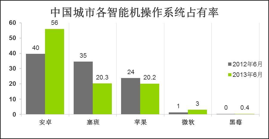 過去的12個(gè)月里,各個(gè)智能機(jī)操作系統(tǒng)的市場(chǎng)占有率發(fā)生了巨大變化。譬如,安卓至2013年6月底在中國(guó)主要城市占有智能機(jī)市場(chǎng)56%的份額,同比增長(zhǎng)幅度達(dá)到了41%。與此對(duì)應(yīng)的塞班系統(tǒng)卻是過去12個(gè)月中較大的輸家,丟失了14.3個(gè)百分點(diǎn)至20.3%,也就意味著若塞班繼續(xù)其下探速度,市場(chǎng)中50%的現(xiàn)有塞班用戶會(huì)在接下去的12個(gè)月離開購(gòu)買其他新手機(jī),蘋果則可能近期取代塞班成為中國(guó)第二大智能機(jī)操作系統(tǒng)。對(duì)于各手機(jī)品牌來說,接下去很大一部分的商機(jī)則是如何贏取剩余的塞班用戶,而手機(jī)價(jià)格將是取決于這些消費(fèi)者走向的重要因素之一。