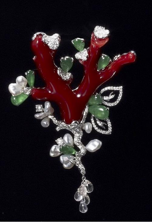 臺灣知名珠寶設計師曾郁雯 - 《一樹花開》古典優雅結合珊瑚、翡翠、無核珠及透明剛玉之兩用針墜